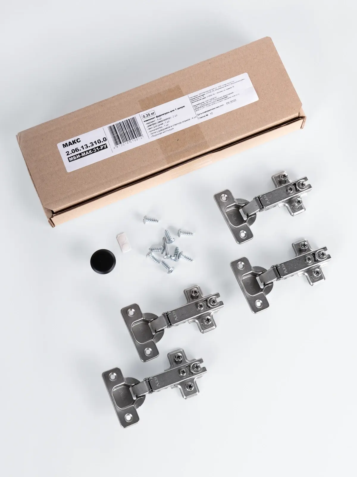 комплект для одного фасада/двери. в упаковке содержится 4 петли от европейского бренда FGV, 2 силиконовых демпфера для уменьшения звуков при закрывании, а так же металлическая ручка-кнопка.